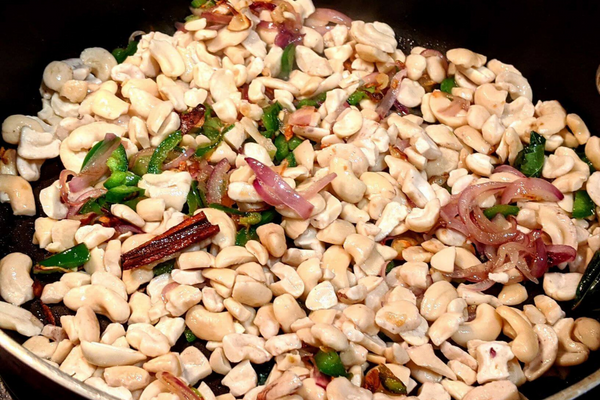 Add a piece of cinnamon stick (one inch) and cashews (previously soaked in water for few hours and water drained out) into the pan