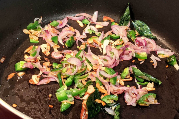 Heat one tablespoon of oil (coconut, avocado, vegetable, canola), and fry the chopped onions, garlic, chilies and curry leaves.